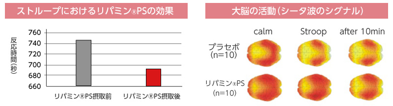 大学生男性20名にリパミン®PS(200mg/日)またはプラセボを毎日6週間摂取して、遅延聴覚フィードバック(DAF)テストによるテキストリーディングで被験者にストレスを与えた後、ストループ・カラーワード・テストを実施しました。